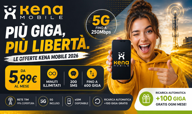 Scopri Kena Mobile 2026: offerte da 4,99€, fino a 600 Giga, rete TIM, 5G e vantaggi con ricarica automatica.